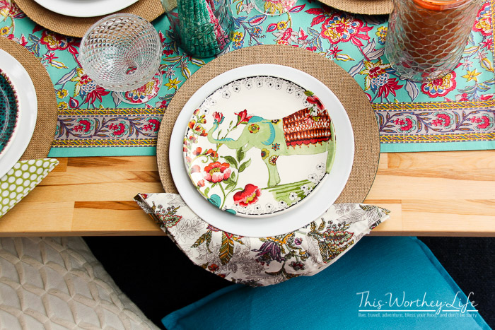 I was able to pull this idea together in no time. Usually, I like to start my ideas off around a theme. The table runner, plates, or centerpiece are my inspiration. I may see a set of plates (like those elephant plates) or a centerpiece and start planning the design around that one (or few) items.