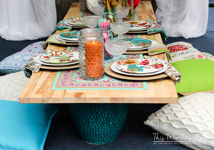 We brought the countertop outside to use as a table, mounting it on two turquoise planting pots. The plan was to keep the tablescape idea simple for a clean feel with positive energy. I added pillows around the table for guests to be able to sit. Guests could also sit right on the carpet.