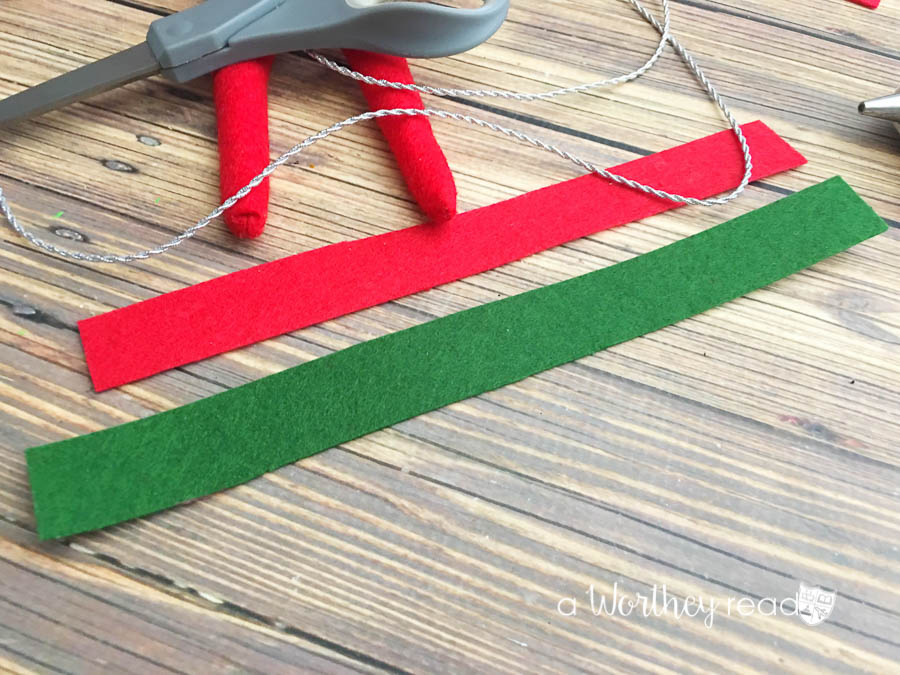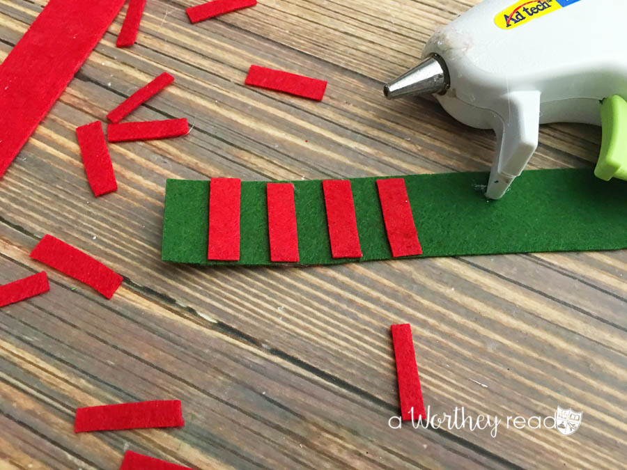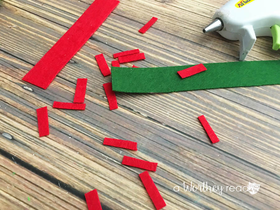 Note: cut about 14 pieces of red felt 1″ long and 1/4″ wide