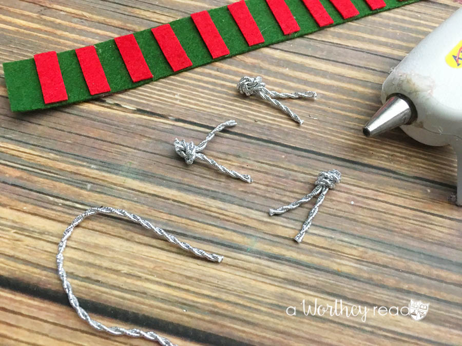 Tie two pieces of silver rope together and cut off just above the knot, make 6 of these