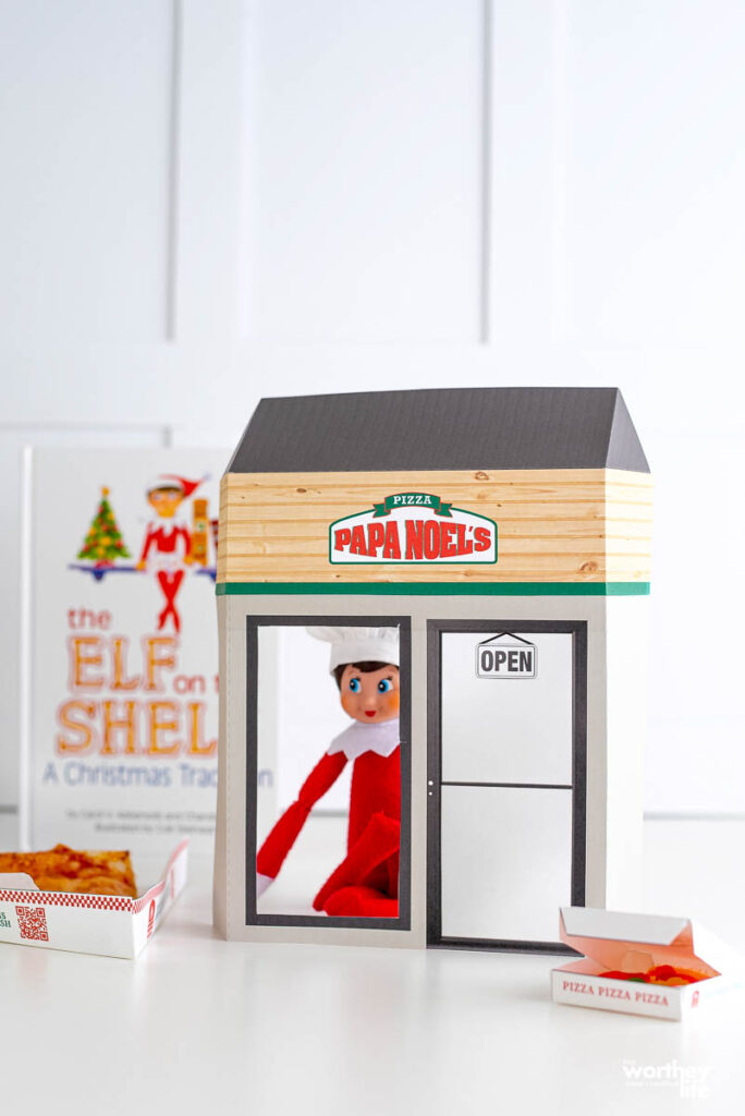 Not only can you print out all the components of this pizza scene below, but we’re also sharing step-by-step instructions on how to put this Elf on the Shelf pizza scene together.