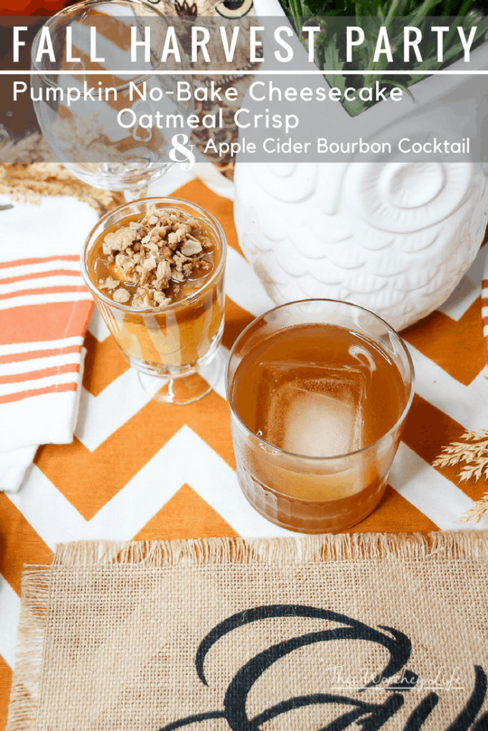 Here are a few fall food ideas you can serve at your upcoming Fall Harvest Party- Pumpkin No-Bake Cheesecake Oatmeal Crisp + Apple Cider Bourbon Cocktail.