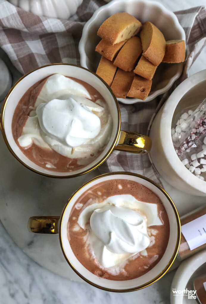 Hazelnut hot chocolate mix. This brings a warm, nutty depth that instantly sets this drink apart from basic hot cocoa, giving it a deeper flavor and hot chocolate vibes.