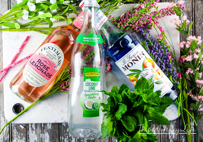 - In a cocktail shaker add Rose Lemonade, Coconut Lime Sparkling Soda, Blue Curacao and Mint Syrup. {if you are going for a sweeter taste, then add the 1 oz of Pina Colada mix}