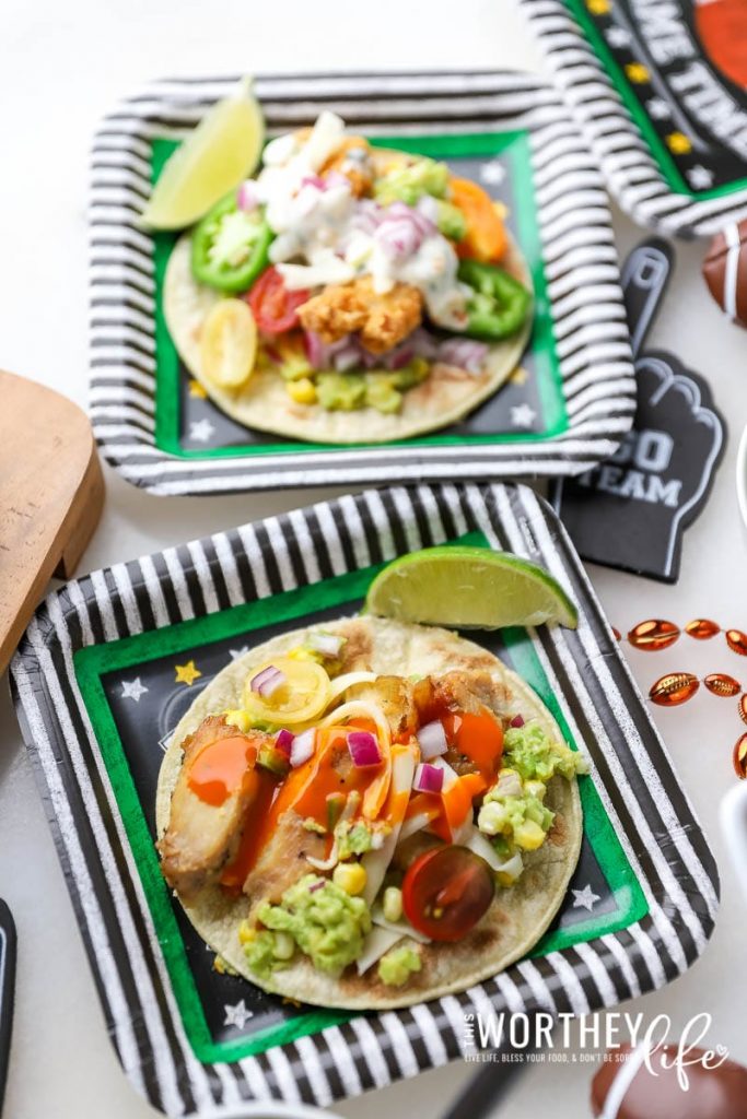 Delicious tacos happen as fast as you can follow the instructions on the package and heat them up. And while you’re heating the Tyson chicken go ahead and prepare the toppings. That means lots of fresh veggies like red onions, shredded cheese, tomatoes, and bring the heat with slices of fresh jalapeño. I also made a Sweet Corn Guacamole as well as a Honey Jalapeño Buffalo Sauce and a Chili Lime Ranch Sauce to drizzle all over these yummy game day tacos. Doesn’t sound good? No flags on this play.
