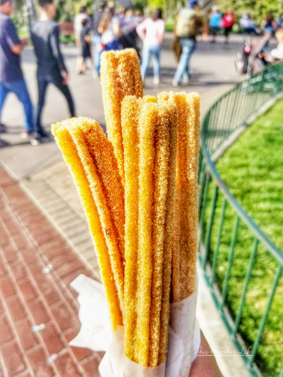 There are so many awesome things to eat at Disneyland and California Adventure Park. We grabbed a delicious pizza for lunch, but throughout the day continued to eat a few well-known Disney food items.