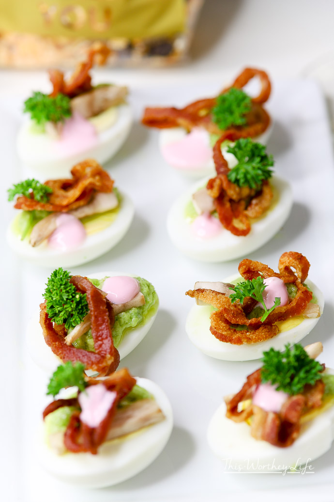 Loaded Deviled Eggs with Bacon with Beet Yogurt Creme