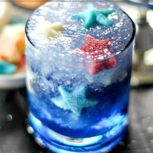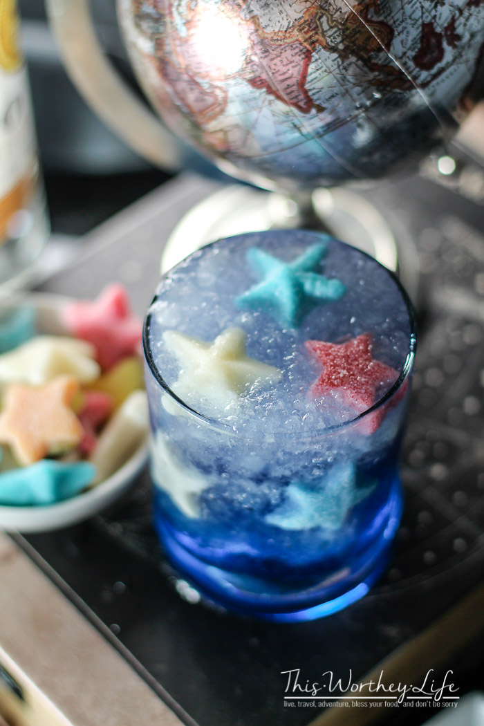 - Strain into a standard rocks glass filled halfway with slush ice and star-shaped candies.