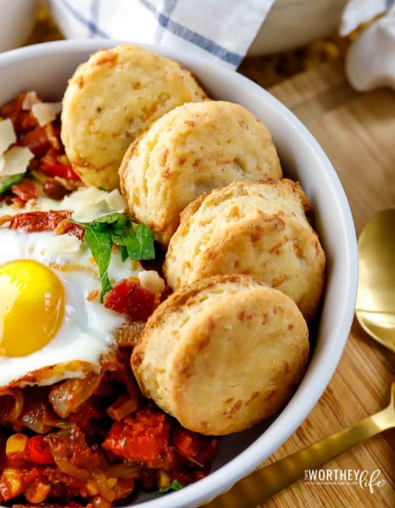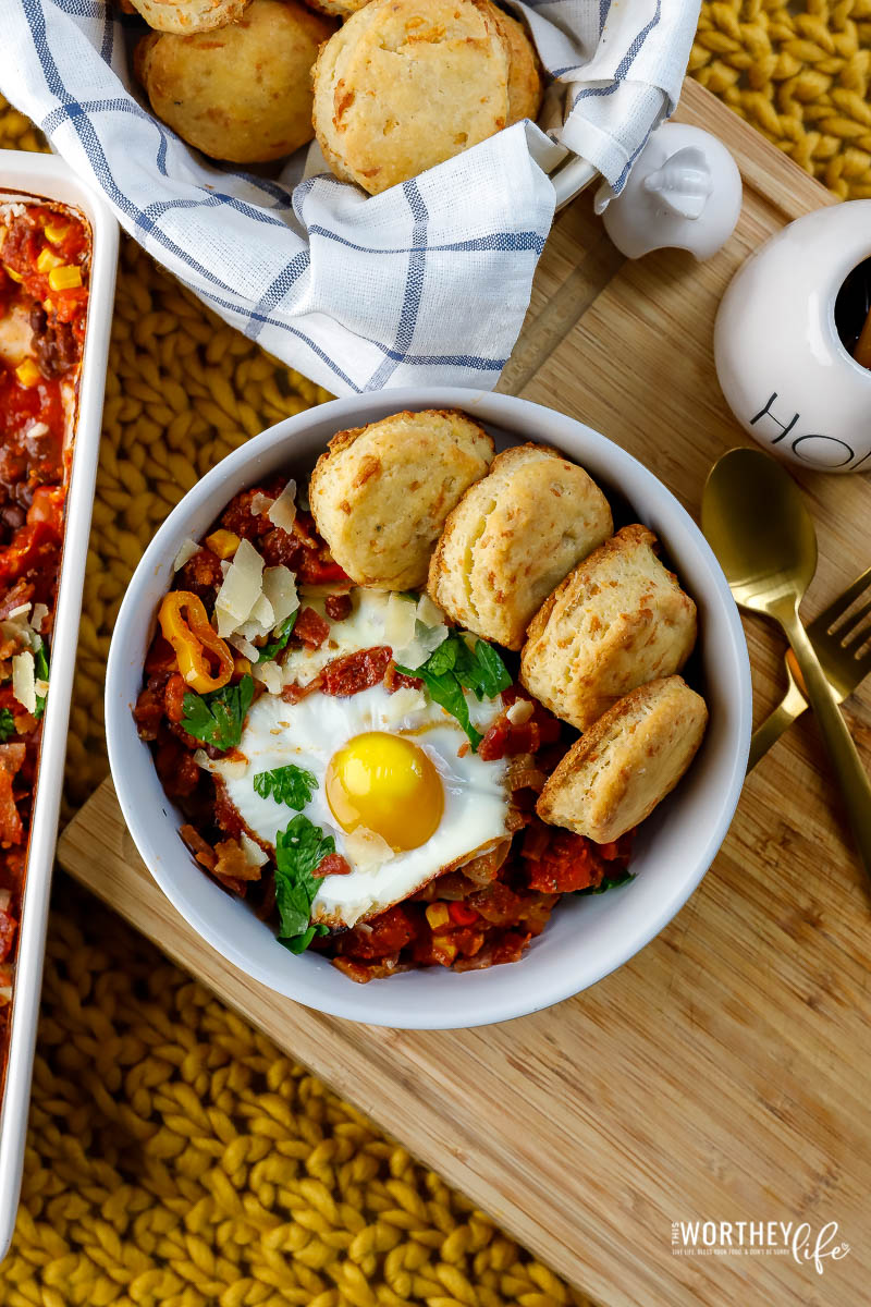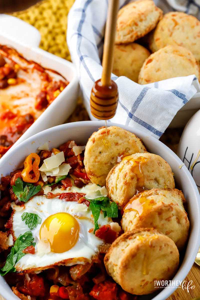 Unlike traditional huevos rancheros, which are usually served with tortillas, this midwest adaptation is paired with homemade Bacon + Parmesan Buttermilk Biscuits. I drizzled a bit of honey over the warm biscuits to give them a little kiss of sweetness.