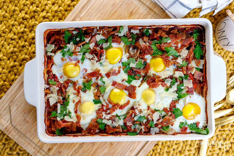 • Remove from the dish from the oven and crack six (6) eggs over the top of the top and return the pan to the oven.