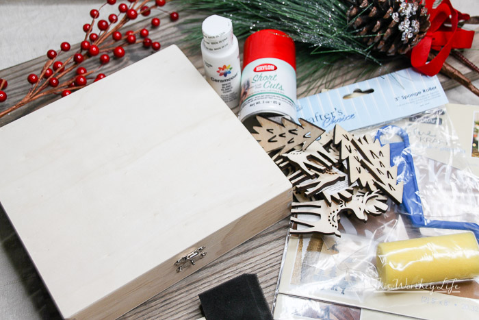 - Once the inside is completely dry, place a holiday stencil at the top of the inside of the box. Paint over the stencil decal with white paint.