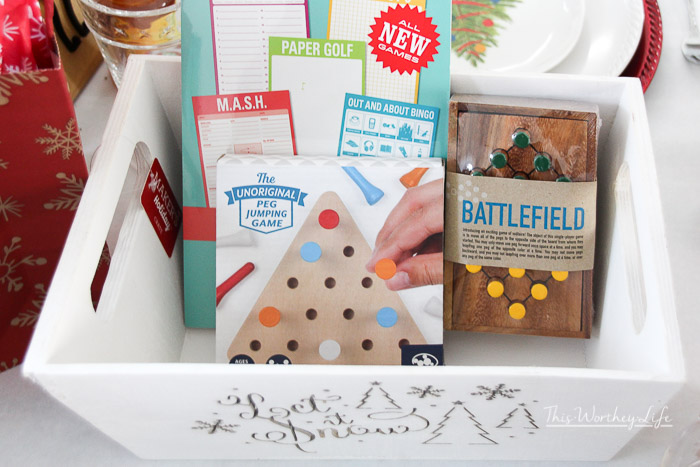 I like portable games, card games, and small board games I can carry with me (when we travel) or that will fit comfortably on the table without disturbing the table setting.