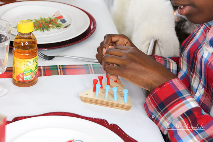 No one wants hangry kids during the holidays. I’m sharing ideas to keep kids busy while waiting for the holiday dinner, plus a kid’s holiday tablescape idea below.