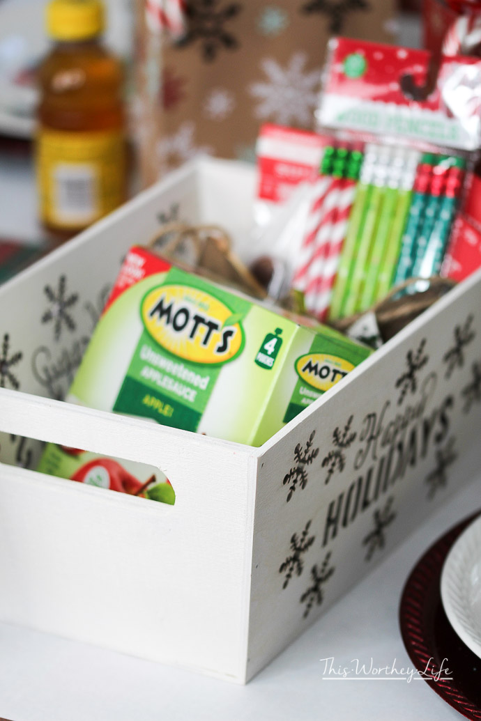 Inside the bags, I will put candy canes, party favors picked up at Dollar General, and snacks to keep them from the “I’m starving” phase until the food is ready.
