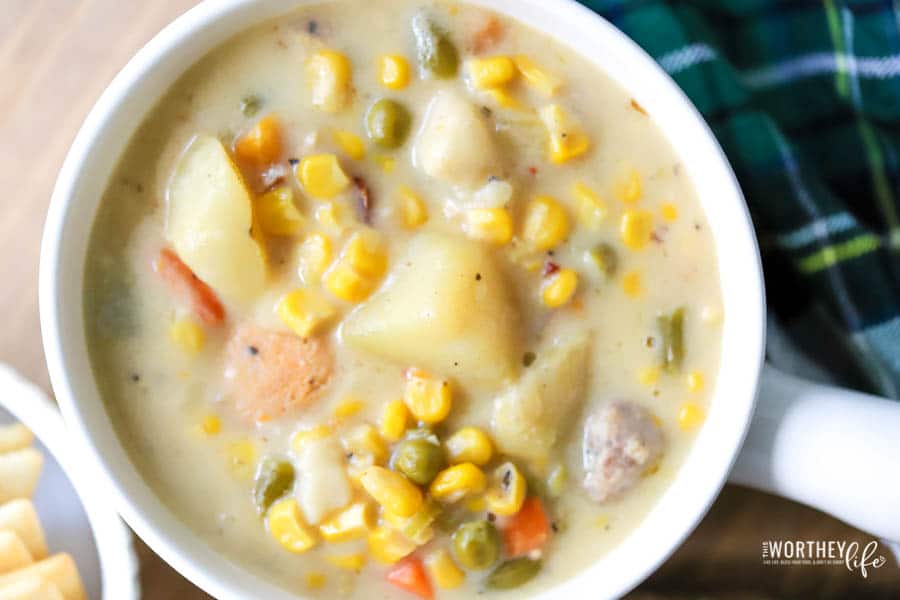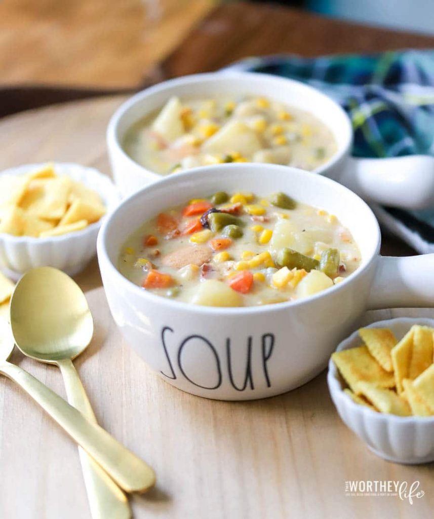 Mixed Vegetables. This chowder is packed with veggies by using a can of mixed veggies, but feel free to use frozen of fresh veggies as well.