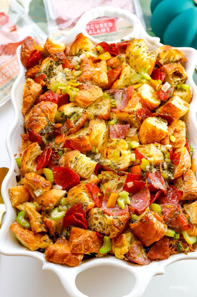 Uncured Pepperoni. Chopped Prosciutto. Italian Sausage. Here’s where this dressing recipe gets interesting and so much fun. Adding uncured salami, prosciutto, and browned Italian sausage is a game-changer and a fun, off-the-beaten-track take on one of the most iconic Thanksgiving recipes ever!