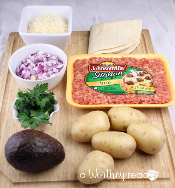 - Wipe pan clean and toss in a flour tortilla and toast on both sides. Place toasted tortilla on a plate and fill it with Johnsonville sausage, potatoes, red onions, parsley, cheese.