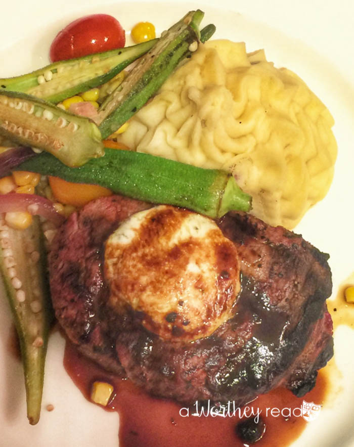 Derrick ordered their Shrimp & Grits {“multi-award winning” Georgia white shrimp & stone milled yellow grits garlic, scallions & andouille sausage}. I had a Grilled 7 oz Filet Mignon {herb Boursin cheese, caramelized shallots, roasted garlic whipped potatoes truffle bordelaise}. We both enjoyed our meals, all five of us went to bed on satisfied stomachs.