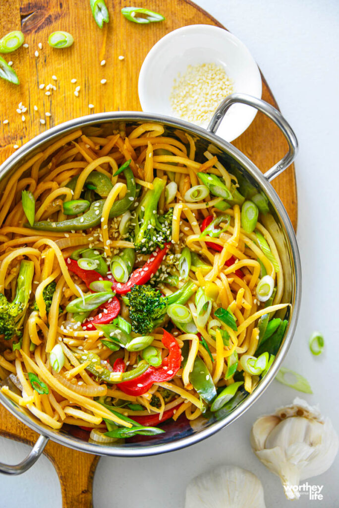 lo mein recipe in a skillet on a board