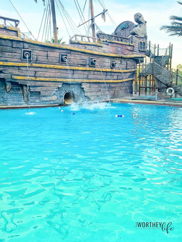 The kids get to be pirates aboard a massive ship that has a water slide right through it. The zero-depth entry of the pool allows parents to relax in a lounge chair nearby while the kids safely play in the water. In addition to the comfortable loungers are hammocks and the grown-up favorite of jacuzzi-style hot tubs. Our boys LOVED this! Yes, the teens LOVED this!