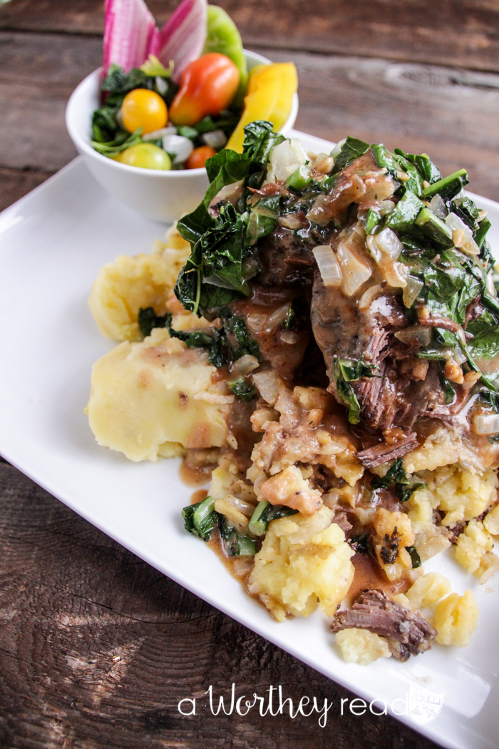 - Ladle Yukon Potatoes with Garlic onto a large platter. Top potatoes with the Braised Lamb Roast. Add the Pan Fried Tuscan Kale & Onions. Finally, drizzle the Pan Gravy over the kale, lamb and potatoes.