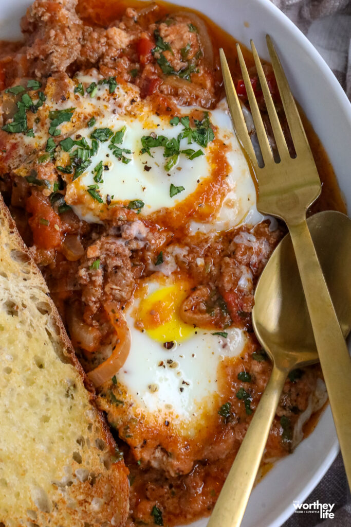 Serve Lamb Shakshuka with toasted sourdough, crusty bread, naan, pita, or even toasted bagels.