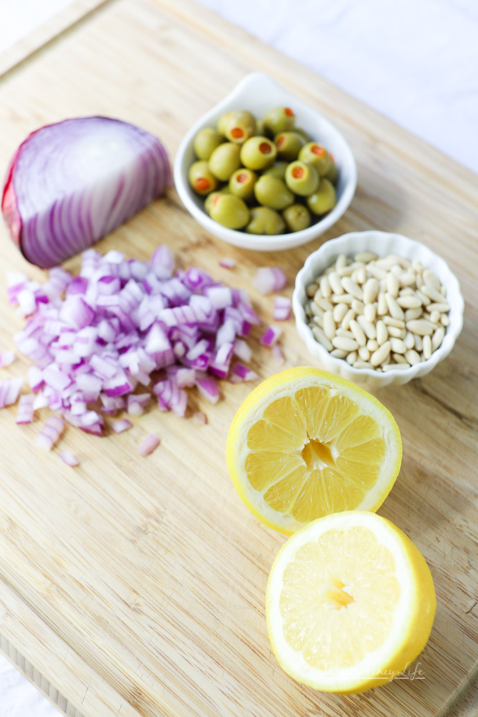 Yes, we’re adding diced red onion, chopped olives, and pine nuts. You can also add a squeeze of lemon juice and a drizzle of extra virgin olive oil too!