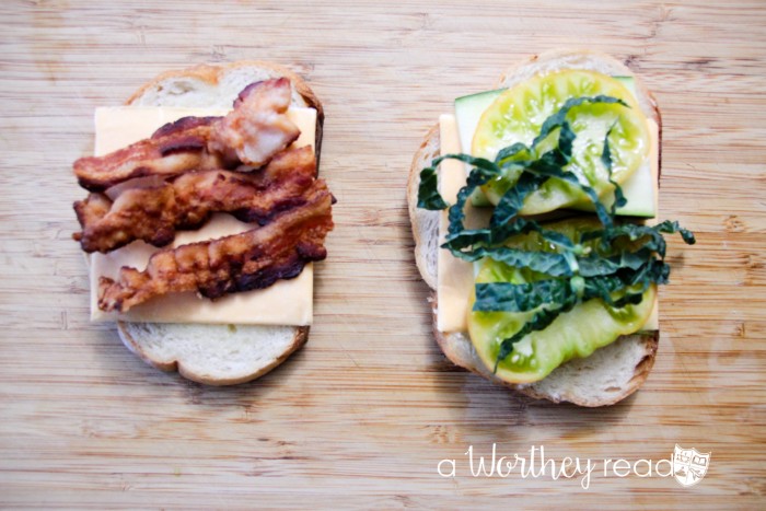- One slice of bread, add 1 slice of cheese, thinly sliced zucchini, tomato, shredded kale, and bacon.
