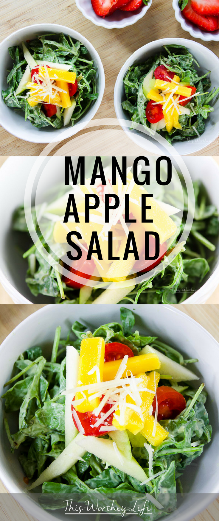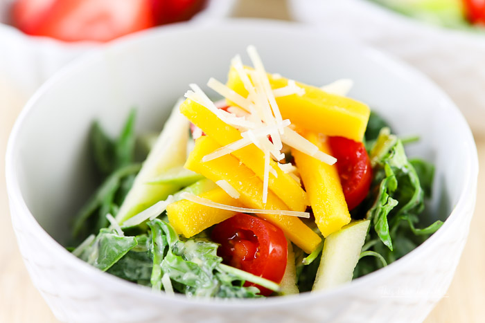 Arugula is one of my favorite salad greens and with its peppery sweetness, it is hard to beat. For this salad recipe, I tossed the greens with homemade mayo, grated Parmigiano-Reggiano, and Truffle oil and it was simply delicious! But that was just the beginning, next I added fresh Granny Smith apples, sweet mango, and slices of cherry tomatoes. I am over here making myself hungry! Excuse me while I drool.