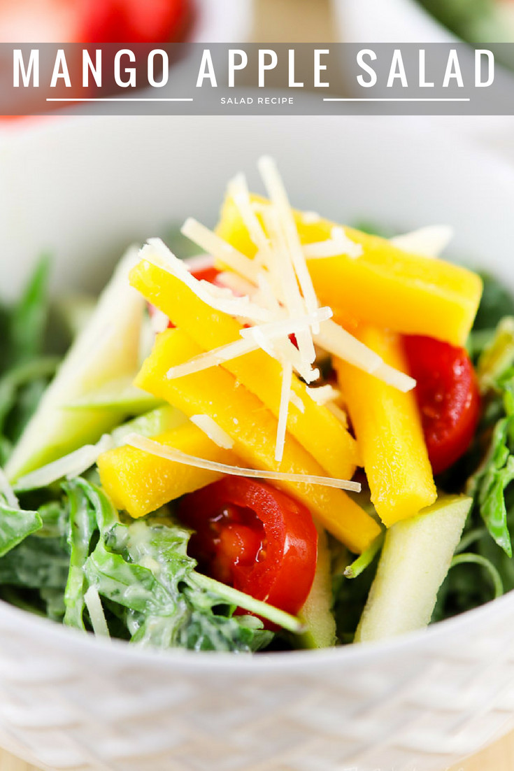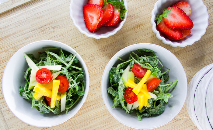 - Transfer the arugula to a serving bowl and top with slices of mango, apples, and mini-cherry tomatoes.