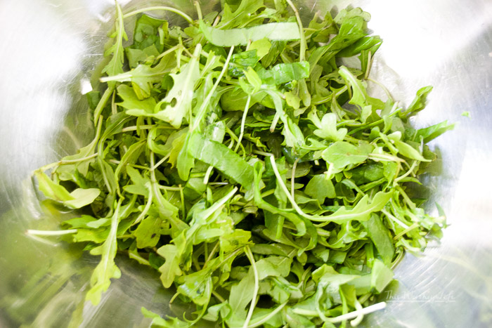 - Toss the salad greens with 1/3 cup of the Honey Avocado + Thyme salad dressing until the arugula is evenly coated.