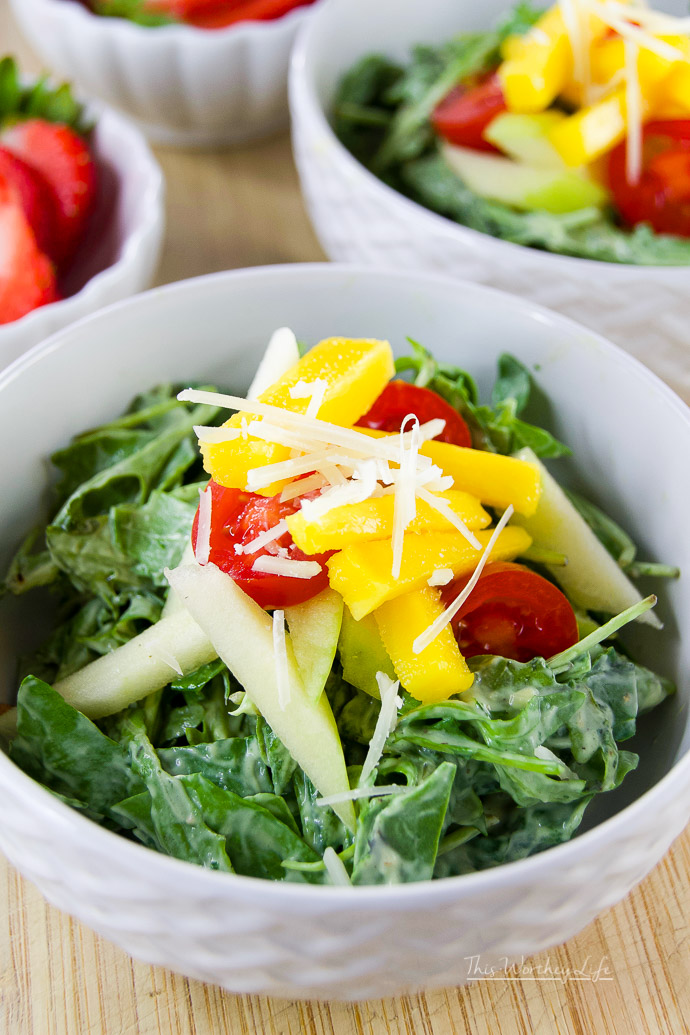 With summer just around the corner, light, no-bake meals are the perfect lunch or dinner. Our mango apple salad is filled with important nutrients, fresh mango, Honeycrisp apples, Parmesan Reggiano, and tons of fresh arugula drizzled with Honey Avocado + Thyme salad dressing. Grab this summer salad recipe down below.