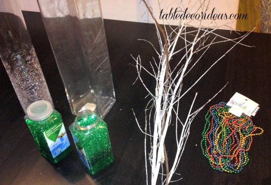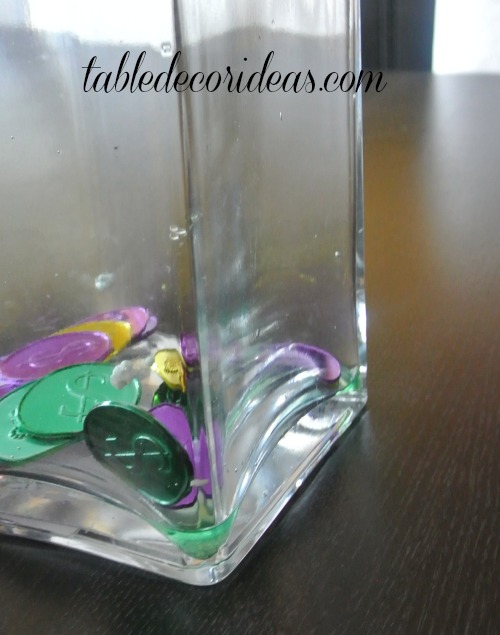Start by putting a handful of fake Mardi Gras money in the bottom of the vase.