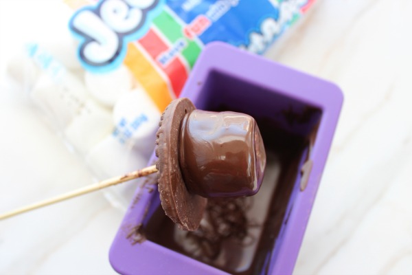 - Set dipped marshmallow in the middle of a cookie solid chocolate side up.