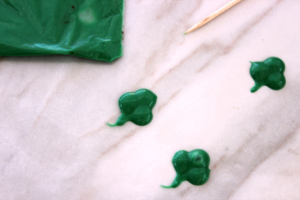 - Pipe three dots onto way paper and use a toothpick to make a stem. Repeat this to make 6 shamrocks.