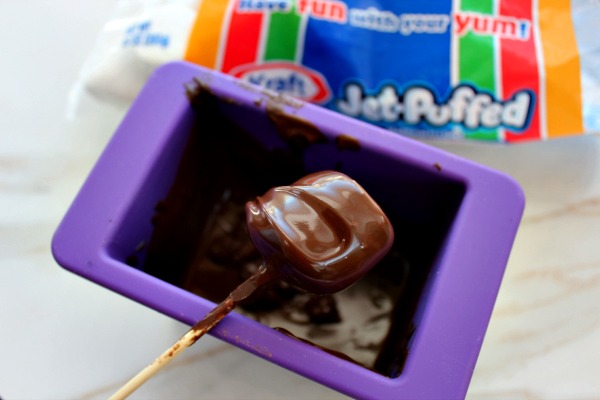 - Dip the marshmallow in melted candy and roll to coat completely.
