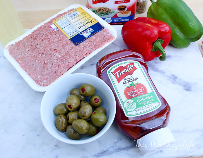 - In a large bowl, add ground beef, onion and pepper mixture, seasoning, bread crumbs, eggs, chopped olives, French’s Fried Onions, and French’s Ketchup.