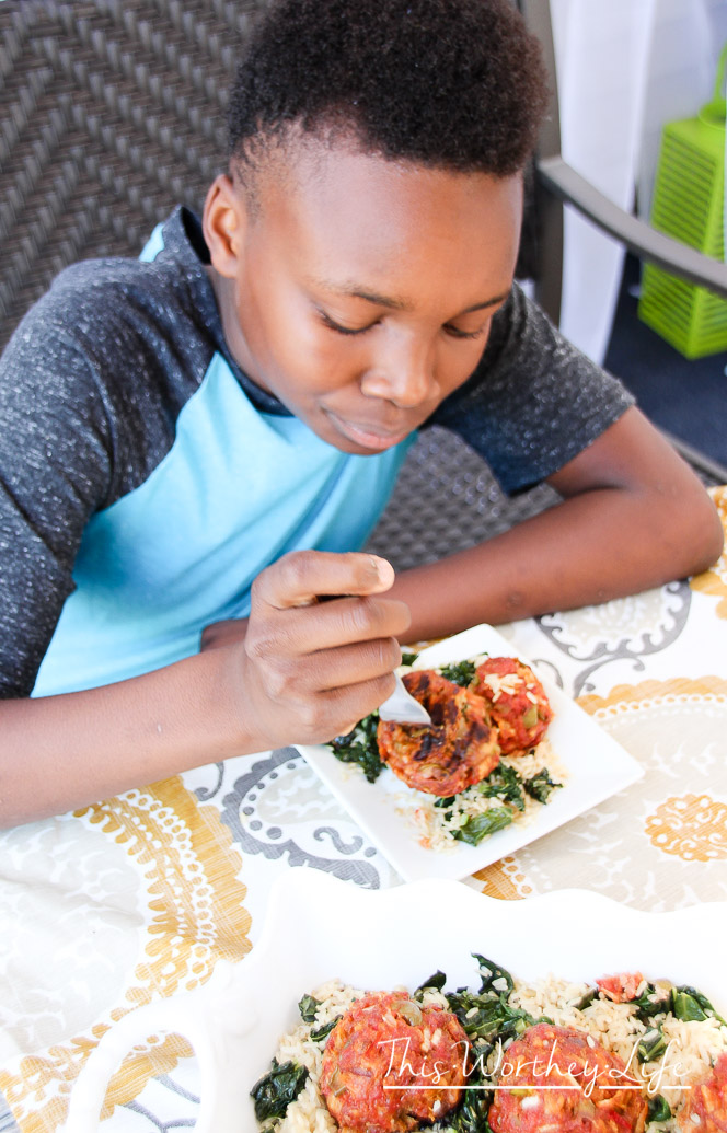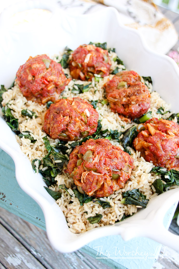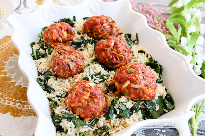 - Allow the meatballs to cool for about 10 minutes, then serve with brown rice and chopped pan-fried kale (you can also serve them with pasta or another vegetable or side of your choice).