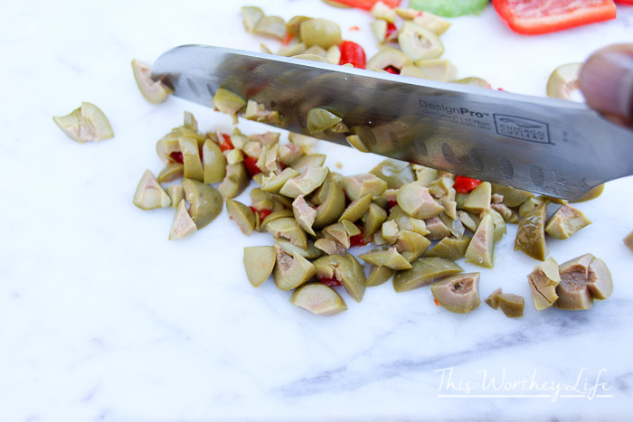 - Place a skillet over med-high heat and add extra virgin oil. Add onions, green and red peppers, and garlic when the oil is hot.