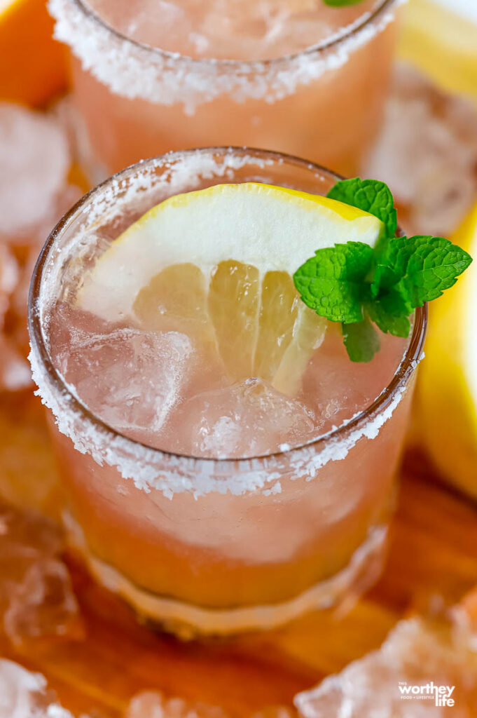 Then pour into the dredged salt with your cocktail. If you want to make this in advance, leave out the ice. You don’t want the ice to melt and water down the drink. So add ice to your glasses, and pour that way.