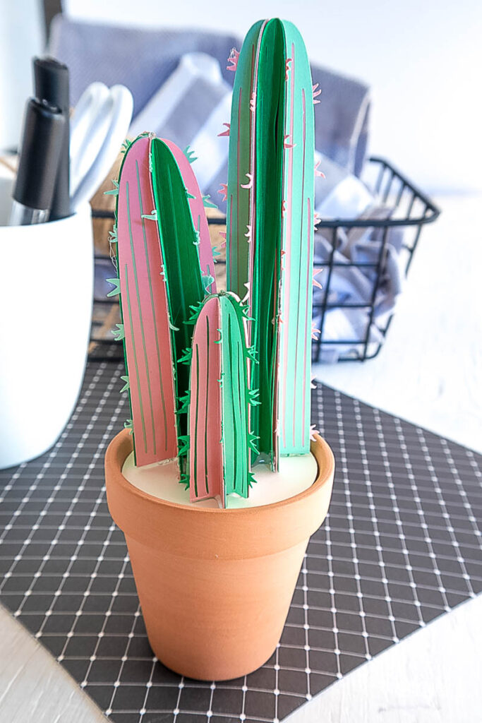 I’m a big plan of fresh and live plants, but it’s always fun to create something as well. You can use your cutting machine, like a Cricut to make a paper cactus to use in your office or somewhere around the home.
