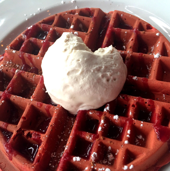 We arrived with our mouths ready to savor some Bourbon French Toast and Mac & Cheese. Unfortunately, the Bourbon French Toast was no longer on the menu. Bummer. So I settled for Red Velvet Waffles while Derrick ordered House Addison Potatoes and Lobster Mac & Cheese.