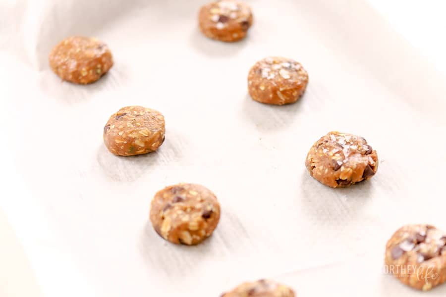 - Line a large baking sheet with parchment paper, then using a two-ounce scoop make cookie dough balls using the palms of your hands. Place the balls of cookie onto the parchment paper-lined cookie sheet, space the cookies at least 2-3 inches apart and gently press the cookies into a disk. Chill the cookie dough in the fridge for 30-minutes. Preheat oven at 350 degrees.