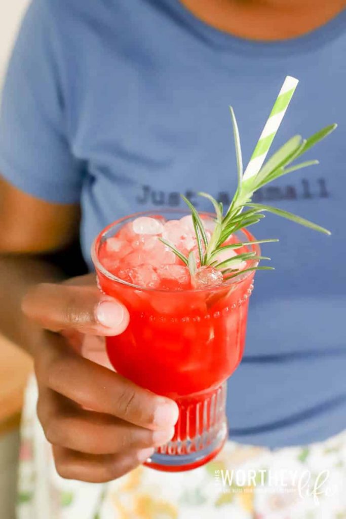 It’s filled with cranberries, sparkling juice, and mint mixed all together to make a Cranberry Spritzer.