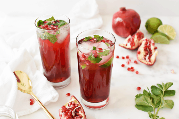 A non-alcoholic sparkling cranberry lime and pomegranate beverage — perfect for holiday entertaining!