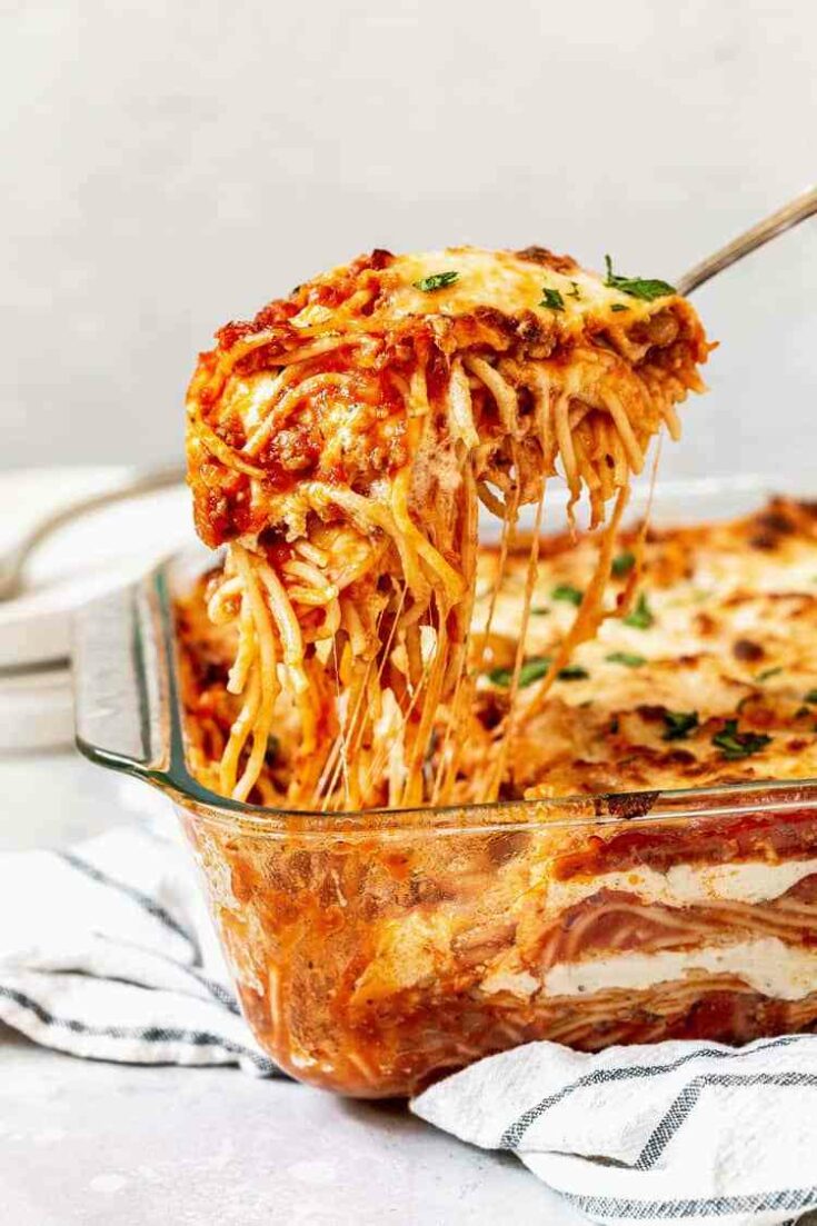 BAKED SPAGHETTI RECIPE (INSANELY DELICIOUS LAYERS JUST LIKE LASAGNA!)