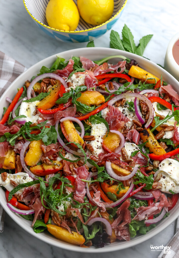 Let’s dig into this Peach Prosciutto Burrata Salad.