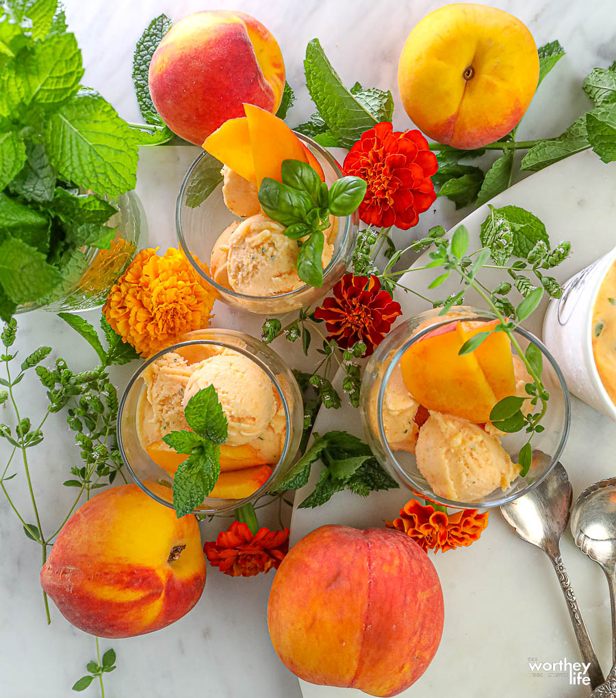 We eat peaches as is or have fun adding them to all kinds of our favorite recipes. Like our, Peach Mint Sorbet made with Peach Truck peaches.