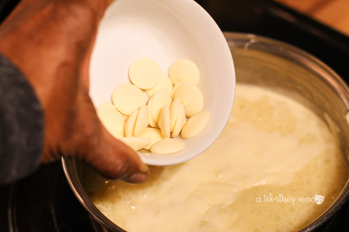 - In a saucepan over med-high heat add heavy cream and half-n-half. When the milk begins to steam add the white chocolate pieces a little at a time, stirring constantly. Continue to stir until the white chocolate is completely dissolved. Add vanilla extract and crushed candy cane. Keep stirring until the candy cane is dissolved.