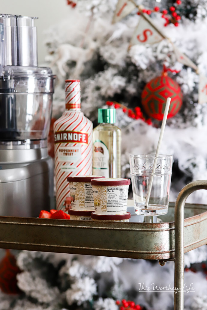 - In a blender add strawberry and vanilla bean ice cream, Smirnoff Peppermint Twist, mint syrup, Ghiradelli Peppermint Bark and crushed candy cane.
